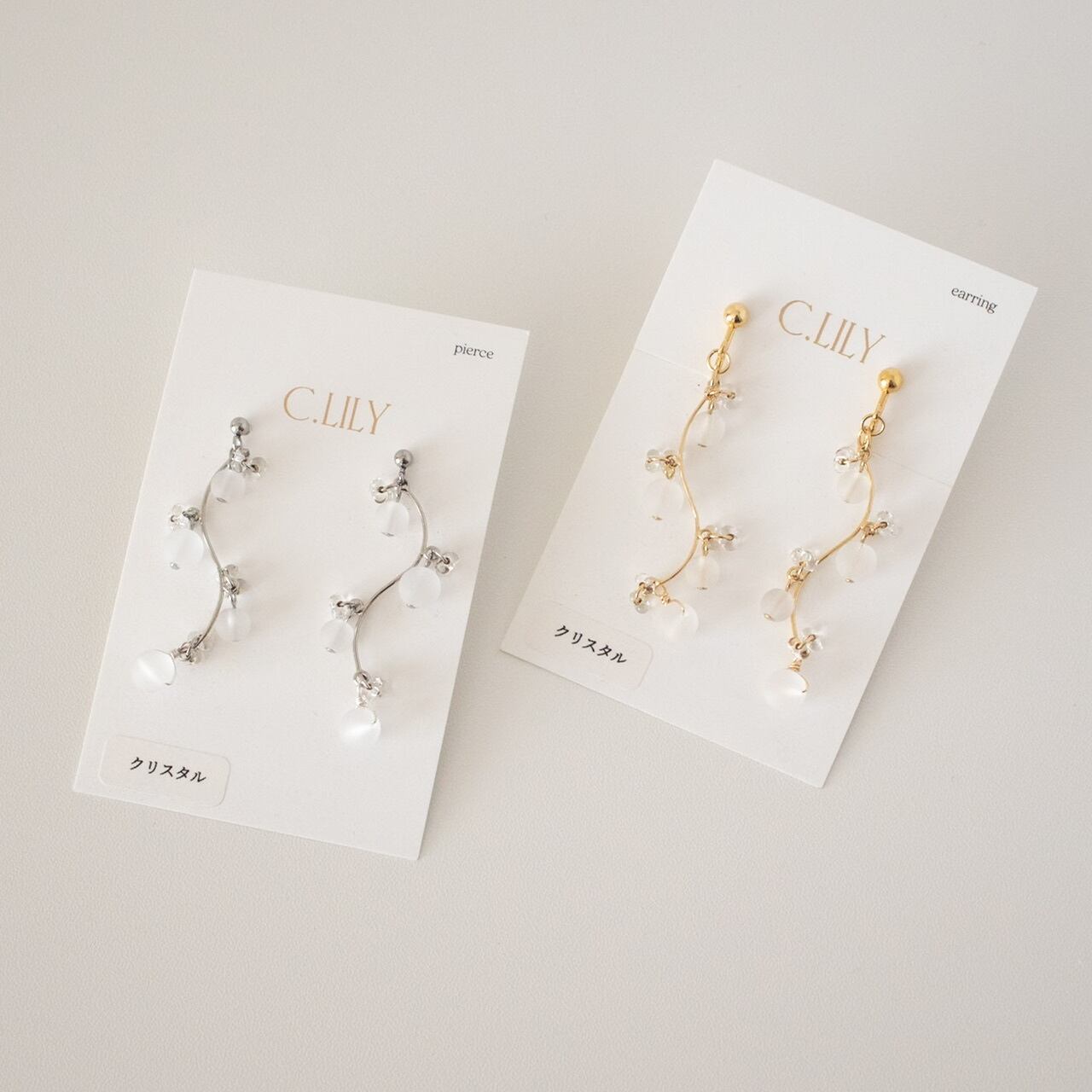 大きさのことなる水晶を組み合わせた、鈴蘭をイメージして仕立てた耳飾り