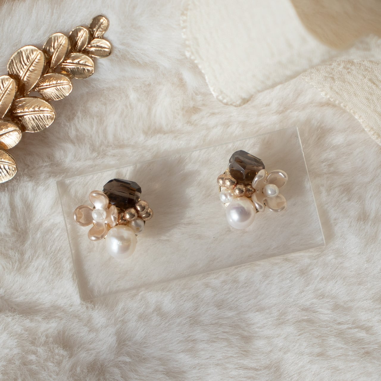 素材:スモーキークォーツ、淡水パール、ガラスビーズ、真鍮(金メッキ)